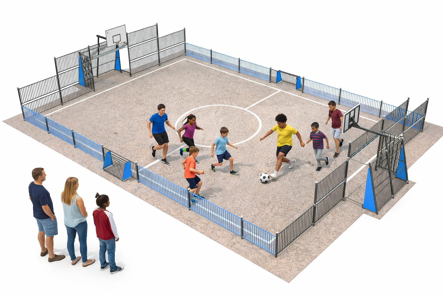 This commercial basketball goal end with integrated rebound fencing is designed for use on Multi-Use Games Areas (MUGAs), school playgrounds, leisure centres and public sports courts. The unit combines a robust steel basketball post, competition-style backboard and heavy-duty rebound fence system, allowing continuous play by keeping the ball within the court area. Finished in a durable powder-coated coating, the goal end is built to withstand heavy daily use in outdoor environments, making it ideal for schools, colleges, local authorities and community sports facilities. The rebound fencing improves game flow, reduces ball loss and enhances safety for surrounding users and spectators. Compatible with basketball-only courts or full MUGA installations, this goal end can be supplied as part of a complete court package or as a standalone replacement unit.Suitable for schools, academies and leisure centres Ideal for basketball-only or multi-sport MUGA layouts Can be paired with anti-vandal fencing, ball stop fencing or court surfacing Available as part of a complete MUGA supply and installation package